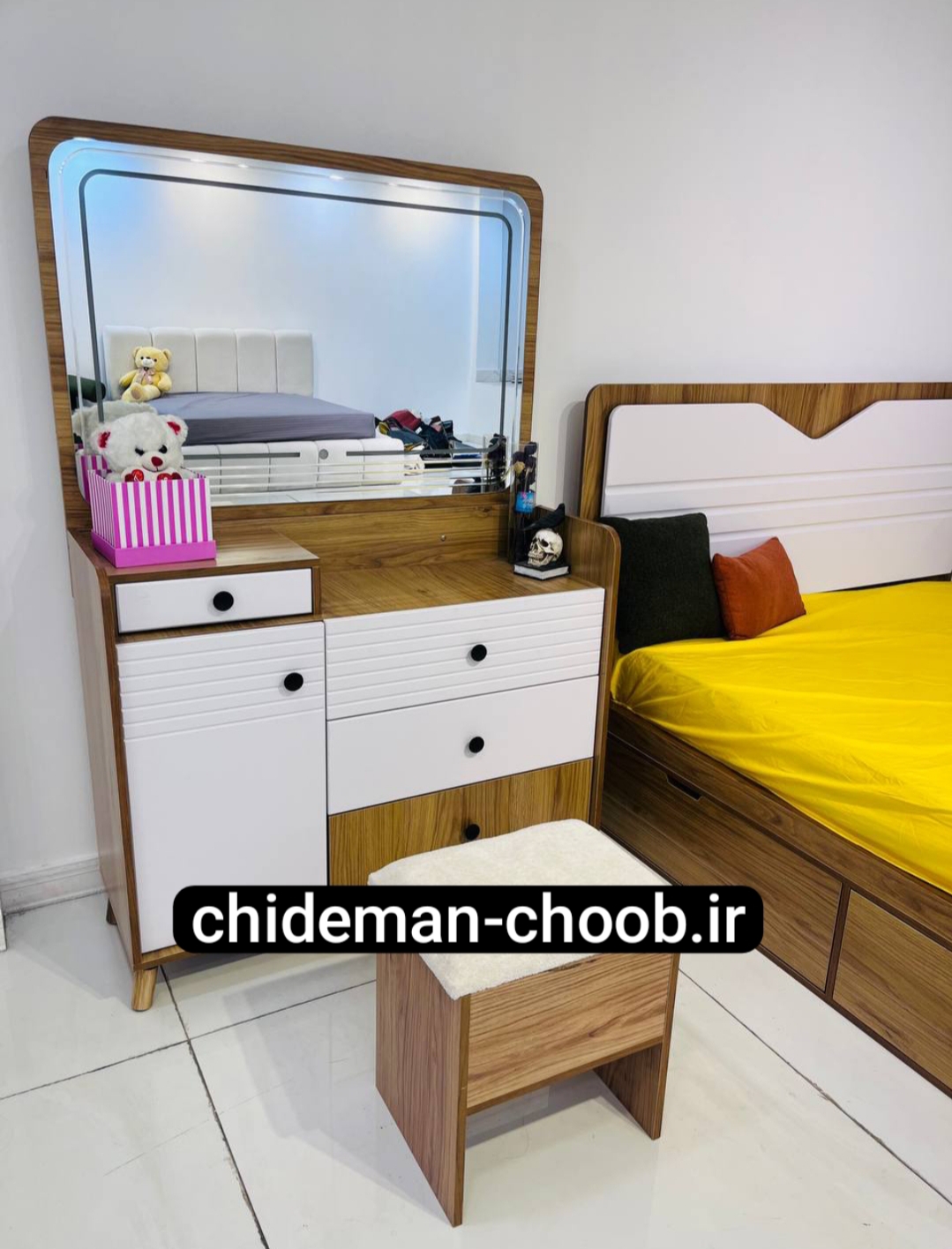 سرویس خواب دو نفره مدل گیلدا شامل تخت 160,دراور,پاتختی,میز آرایش آینه و صندلی